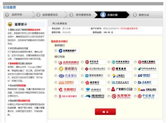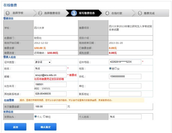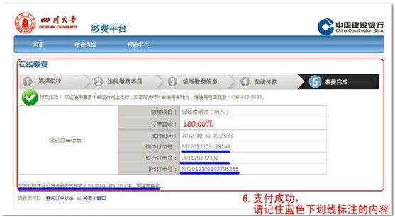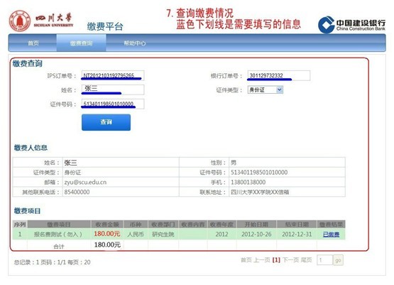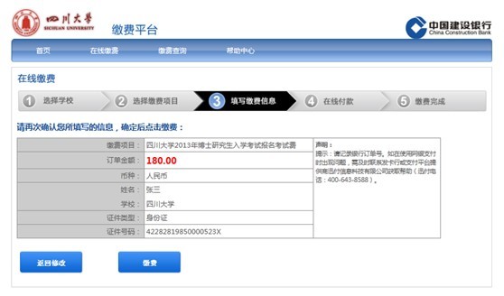 从2013年开始,四川大学采用考生网上支付的方式收取博士研究生入学统考的报名考试费,缴费网址:http://scu.epaybest.com,相关注意事项参照网上缴费注意事项(点击打开链接),具体缴费流程如下: