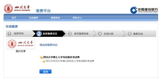 选择“四川大学2013年博士研究生入学考试报名考试费”缴费项目,如下图: