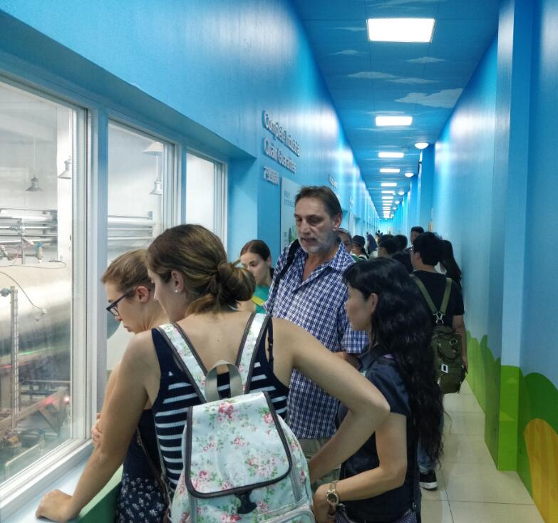 同学们看完视频后,便开始了正式参观。首先,UIP项目的同学参观了新希望集团旗下的“美好”企业三期工厂车间,“美好”企业主要生产各种类型的火腿肠。大家透过车间外玻璃窗清晰地看到制作火腿过程中单个包装、消毒灭菌、成箱包装的基本流程。外国同学表现出极大的兴趣,一边认真地听讲解员讲解,一边仔细地观察各种生产设备及生产步骤,并不时地与孙群教授和2015级生物技术班同学们讨论关于火腿生产的相关问题。
