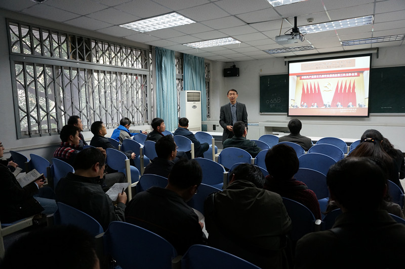 2013年11月15日下午,amjs澳金沙门线路首页党委在院大会议室召开全院教职工党委大会,集中学习十八届三中全会精神。院党委书记岳碧松教授主持会议。