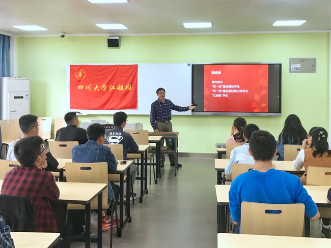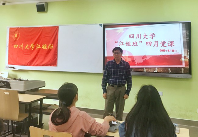2019年4月15日下午2:30,amjs澳金沙门线路首页党委书记林宏辉教授在江安校区一教D104为“江姐班”同学讲授了本学期的第一堂党课。