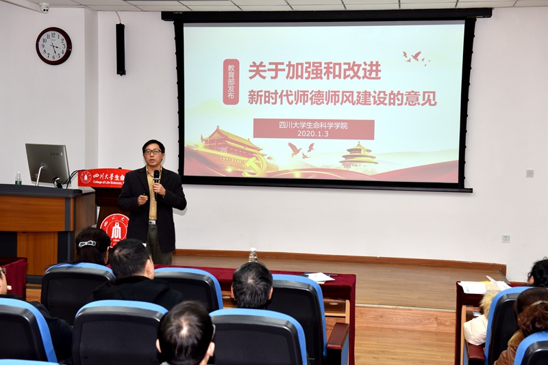 2020年1月3日,amjs澳金沙门线路首页组织全体教职工在学术报告厅集体学习《关于加强和改进新时代师德师风建设的意见》。学院党委书记林宏辉教授主持学习并讲话。