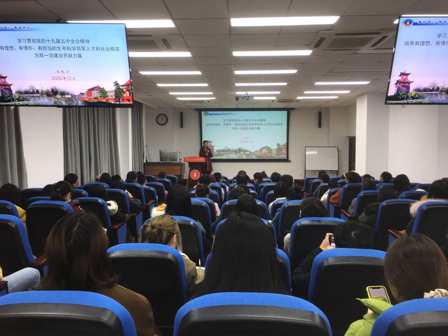 2020年12月1日下午,amjs澳金沙门线路首页院长王红宁教授在学院A101会议室为学院学生党员、发展对象和入党积极分子作了《学习贯彻党的十九届五中全会精神,培养有理想、有情怀、有担当的生命科学领军人才和社会精英,为双一流建设做贡献》专题党课。
