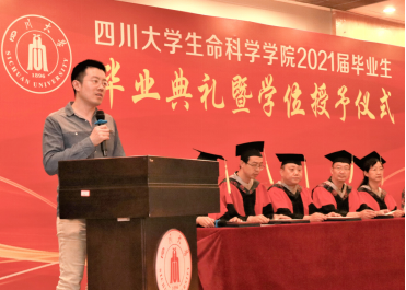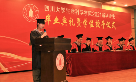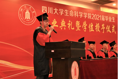 研究生代表,四川省优秀毕业生、四川大学优秀学生干部2018级博士生梁鹏宽进行了发言。作为一名“川三甲”通过323计划在川大生科院求学八年,当初就是因为心目中“川大就是最好的大学,生科院就是最好的学院”。一路走来,融入学校、融入集体、以校为荣的成长过程中,不仅收获了知识,更磨练了心性。他提到,我们不要把毕业理解为分道扬镳,离别都是为了更好地重逢,希望大家都能保持联系,保持初心,努力奋斗,常回“家”看看。