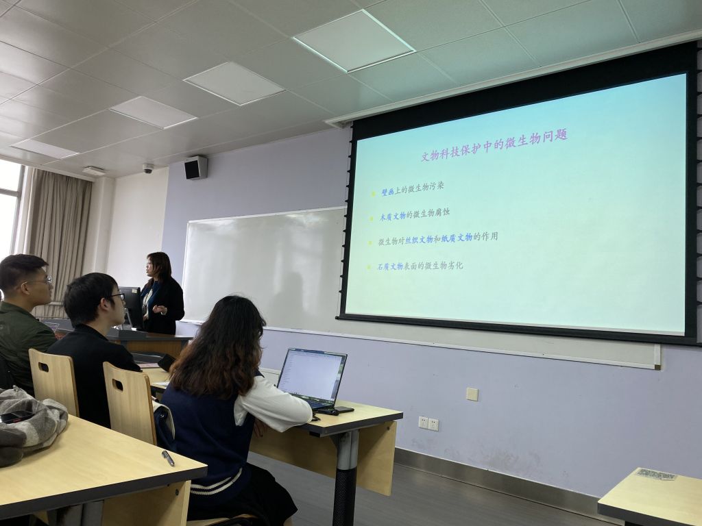 潘教授首先从介绍世界著名文化遗产文物引入,提出文物中是否存在微生物的问题,让同学们带着疑问与兴趣进行本次讲座。接着为同学们讲解了不同类型的微生物问题,呼吁大家用生态意识去审视文物中的生物问题,通过和同学们一起回顾生物之间的相互关系、微生物的种间关系来介绍文物科技保护中生物技术运用问题的背景与目的,由浅入深。同时潘教授讲解了一些常见的文物科技保护中的微生物问题,诸如壁画的污染、木质文物的腐蚀、微生物对丝织文物和纸质文物的作用以及石质文物的劣化等问题,提出现在使用的电子显微镜成像、分子检测、免疫学方法和气象色谱法等解决方法,旨在高效、无损的情况下对文物进行合理保护。后续潘教授也为大家详细介绍了她及她的团队对高句丽王城、王陵及贵族墓葬遗址的微生物问题及文物保护研究与考察经历与见闻,并提出现存的文物科技保护问题。