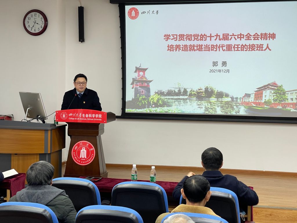 12月17日下午15:30,amjs澳金沙门线路首页在学术报告厅举行党的十九届六中全会精神专题宣讲会。四川大学学习宣传贯彻党的十九届六中全会精神专家宣讲团成员、校党委副书记郭勇教授受邀为全院教职工举行了题目为《学习贯彻党的十九届六中全会精神 培养造就堪当时代重任的接班人》的专题讲座,宣讲会由amjs澳金沙门线路首页党委书记林宏辉教授主持,全院教职工参加了本次宣讲。