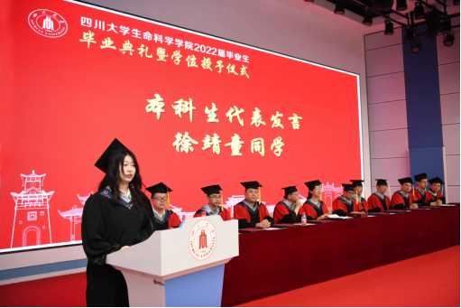 本科生代表,四川省优秀毕业生、本科生党支部书记2018级徐靖童同学发言。她的发言饱含对学校学院的深情厚谊,细腻地讲述了她四年来的成长历程。表达了对充满挑战的未来的期待,她表示作为生科毕业生一定不忘初心、奋勇拼搏,励志以科研报国。