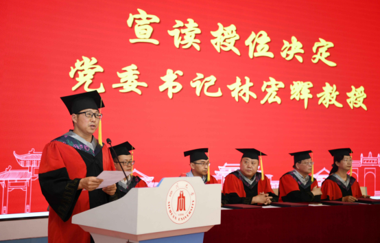 代表们发言之后,amjs澳金沙门线路首页党委书记、院学位委员会副主席林宏辉教授宣读了授位决定,同学依次登台,进行了拨穗仪式并领取了学位证书。