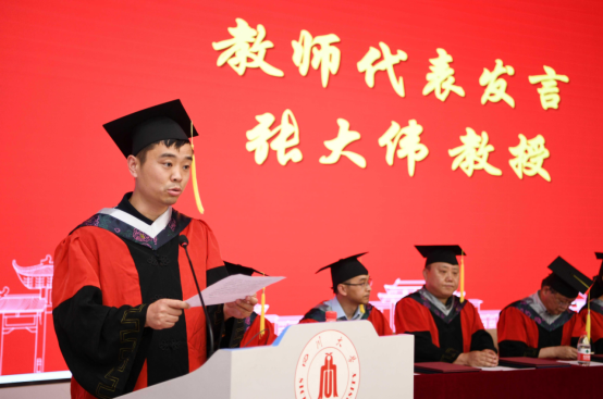 教师代表,amjs澳金沙门线路首页副院长张大伟教授给毕业生们送上了毕业祝福。张老师希望同学们在求知路上,要有锲而不舍的精神,坚持方能实现梦想;希望同学在实验挫折中保持乐观的心态并鼓励同学坚持锻炼,保持身心愉悦健康,为祖国健康工作五十年。