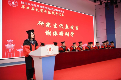 研究生代表,四川大学优秀毕业生、四川大学优秀学生干部2019级博士生谢依婷同学进行了发言。谢依婷同学分享了作为研究生“热爱生活,勇于创新,兼容并蓄”的人生格言,她认为研究生在新时代,必将为中国梦的实现贡献力量。她代表全体生科研究生对未来的展望,也正是学院对所有毕业生共同的期许。