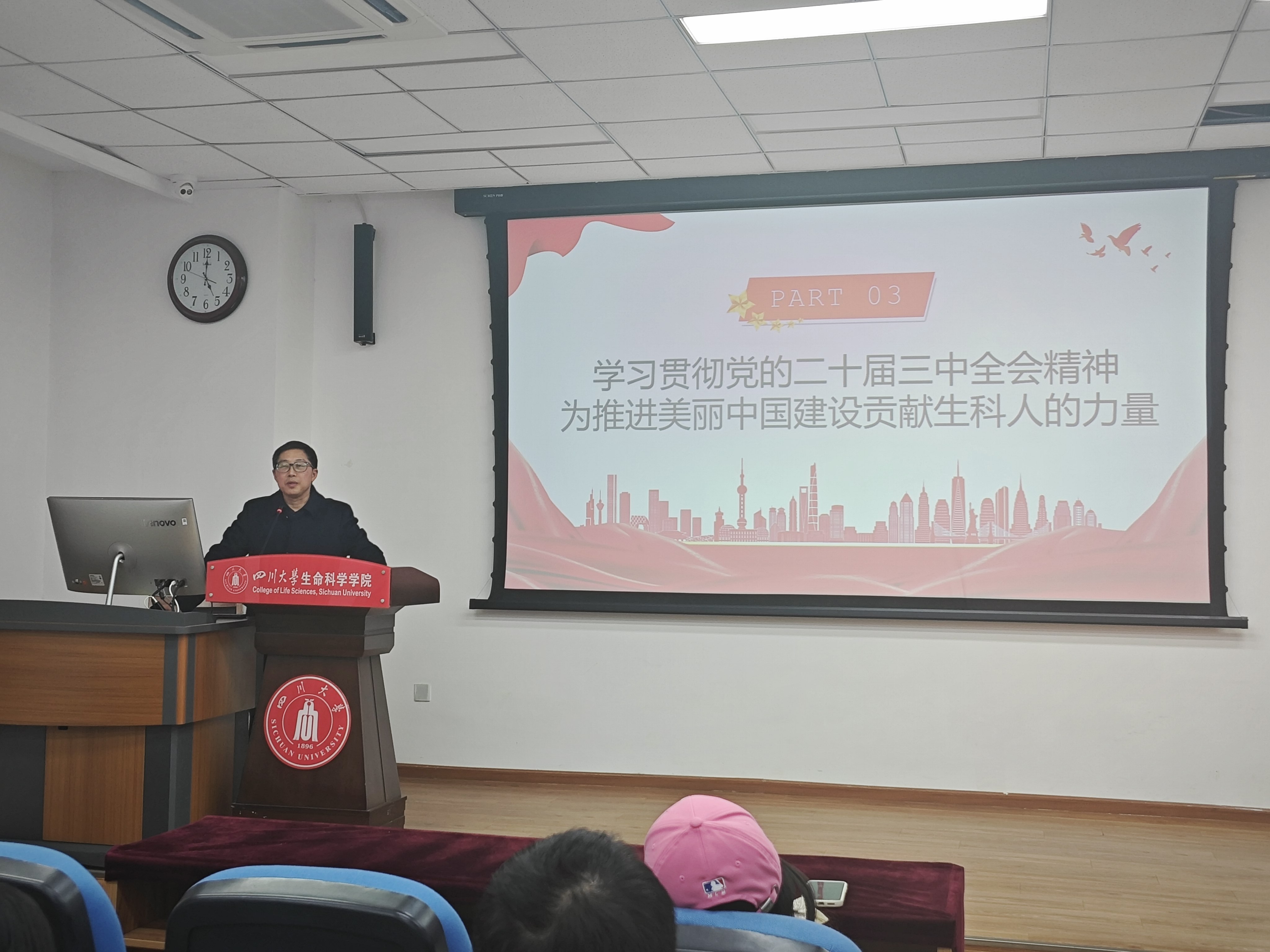 2024年12月17日下午,amjs澳金沙门线路首页党委书记、院长林宏辉教授在A101学术报告厅为学院学生党员及入党积极分子讲授了题为《学习贯彻党的二十届三中全会精神,为推进美丽中国建设贡献生科人力量》的专题党课。