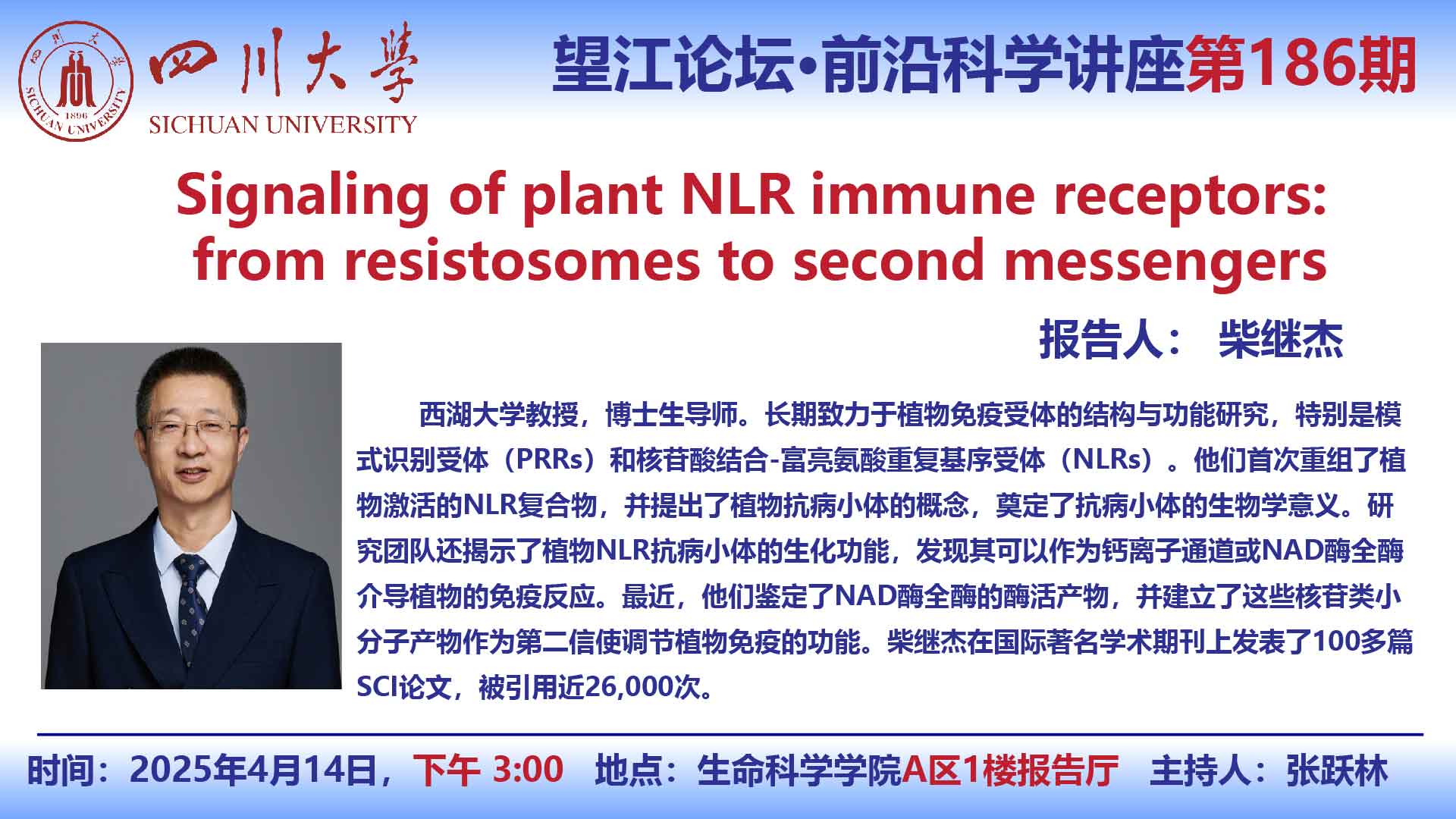 望江论坛-前沿科学讲座(第186期):柴继杰教授4月14日学术讲座